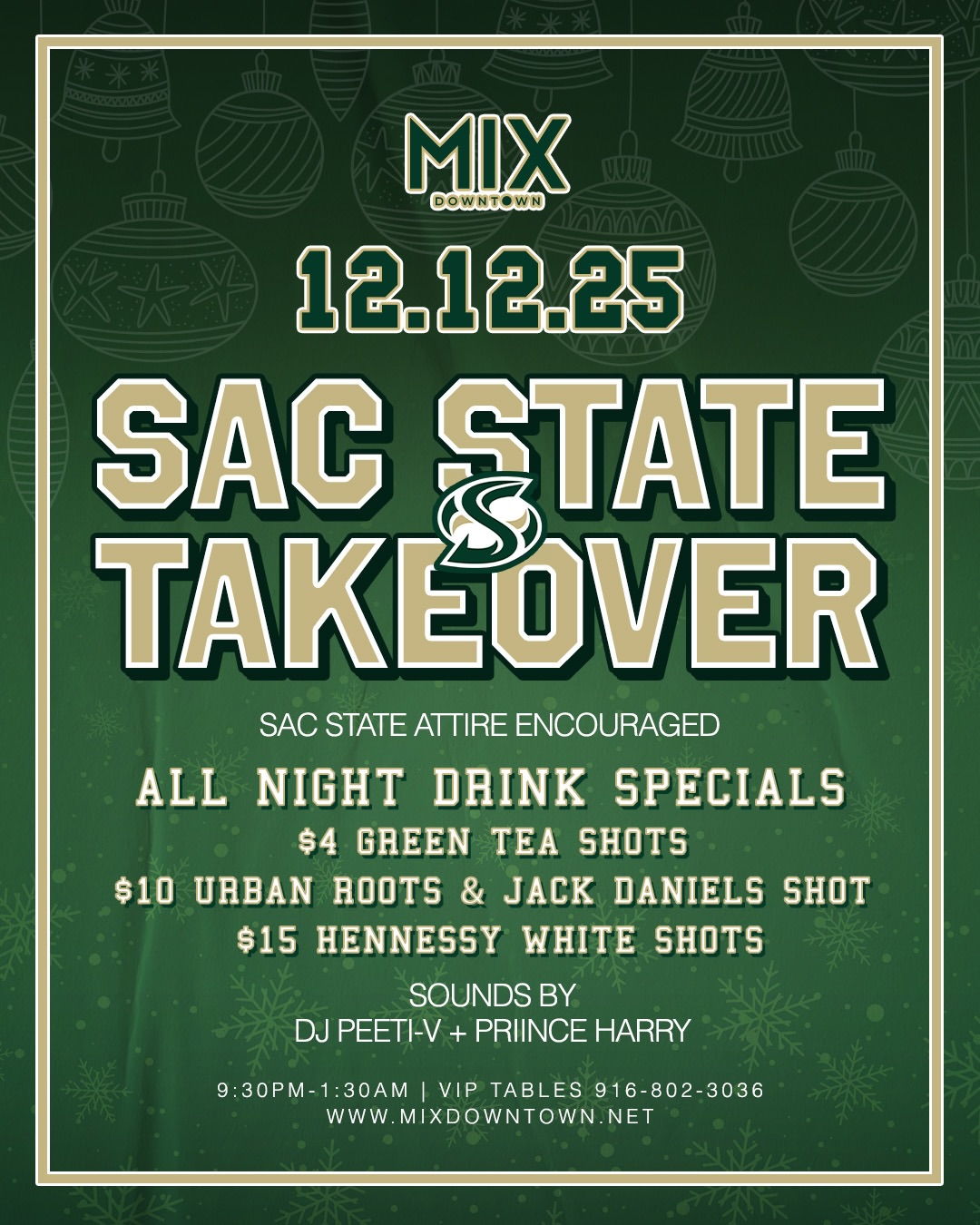 hornets, tomorrow night is your night 🐝💚 sac state takeover is here! throw on that green + gold and roll through for the drink deals: $4 green tea shots, $10 urban roots/jd, $15 henny white — we’re not playing. ✨