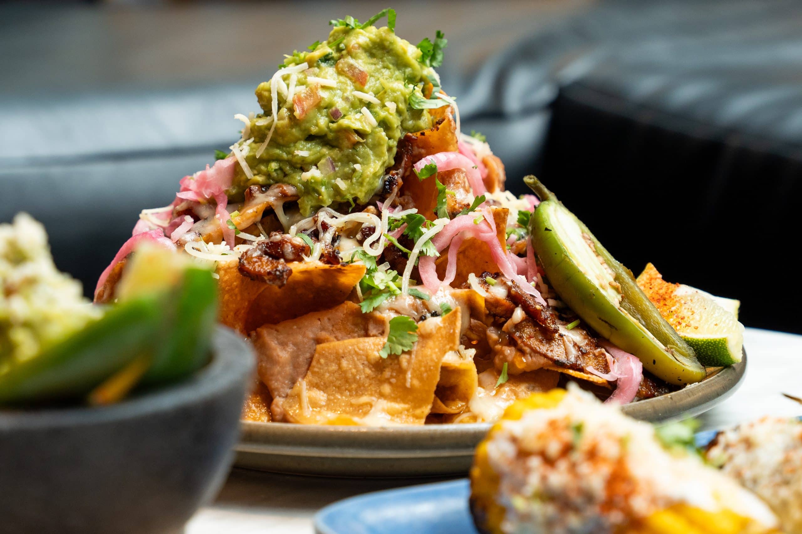 choice of protein (beef, pork, or chicken), mozzarella cheese, cheddar cheese, avocado, refried beans, pickled jalapeños, sour cream, onion, cilantro -